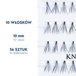 - Profesjonalne i wodoodporne rzęsy w formie kępek. Łatwo odklejające się od pudełka. Długość 10 mm (S). 56 sztuk w paczce. BEZ węzła. 10 włosków z polimeru syntetycznego* dzięki czemu są bardzo elastyczne, miękkie i lekkie.